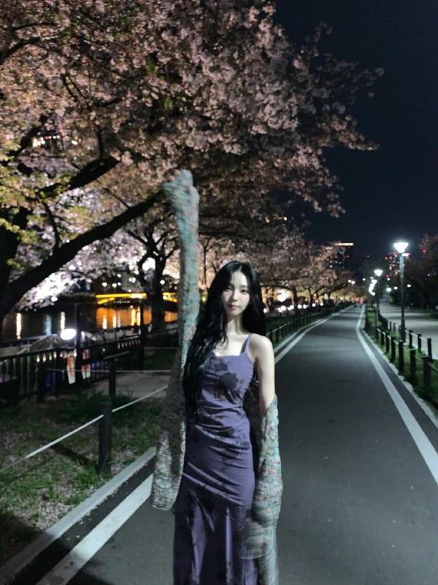 这组2026年4月的春日写真中,柳智敏立于樱花树下,身着一件淡紫色网纱雪纺材质的长裙。