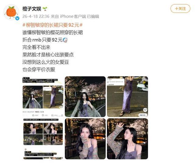 这个价格与明星动辄上万的高奢单品形成了强烈反差,也让“柳智敏 92元裙子”的话题迅速发酵。